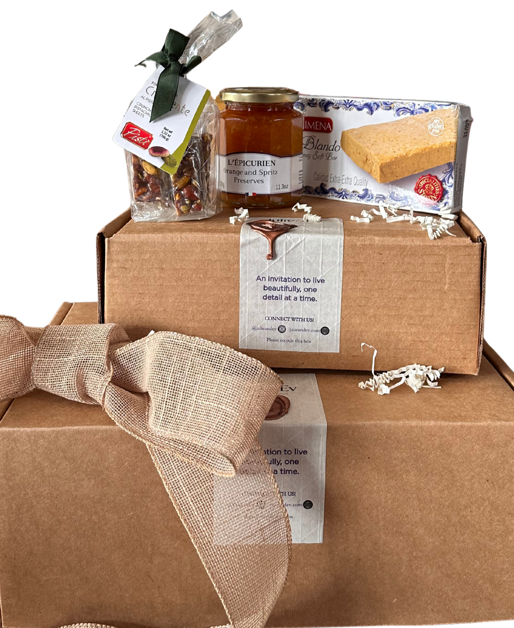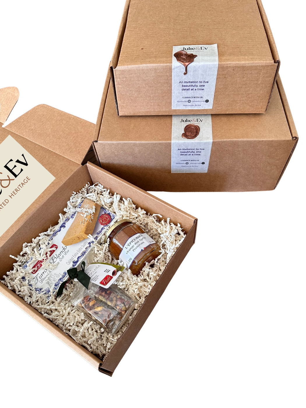 A dessert journey across Europe. Enjoy the zesty sparkle of L’Épicurien’s Orange & Spritz Preserves, the soft, almond-rich Spanish Doña Jimena Turrón, and the crunchy, caramelized Italian Pistachio Croccante. This trio blends citrus brightness, creamy nougat, and pistachio crunch. An elegant treat box that feels both festive and timeless.