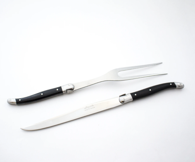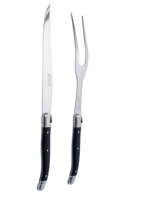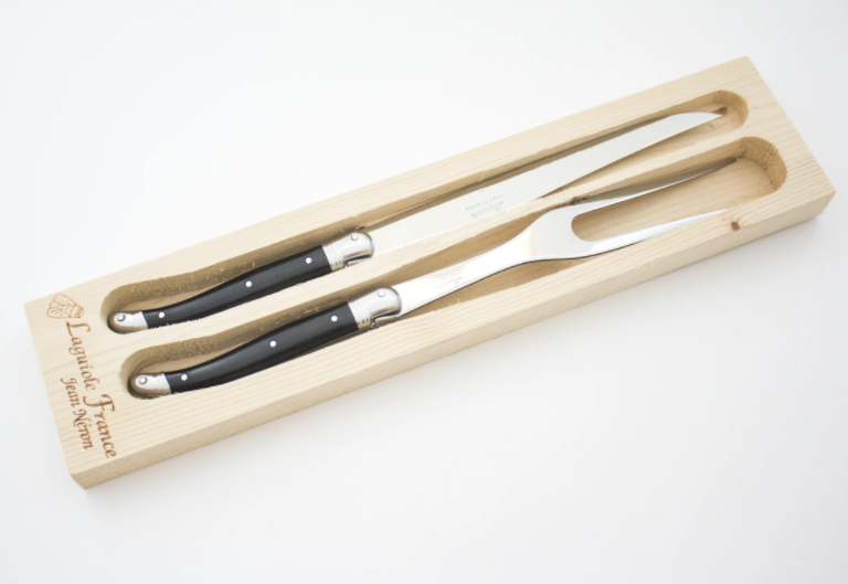 The town of Laguiole has been producing high-quality knives since the mid 19th century. Each piece is assembled by hand and this cake serving set comes in a wood tray which features the bee detail synonymous with Laguiole.