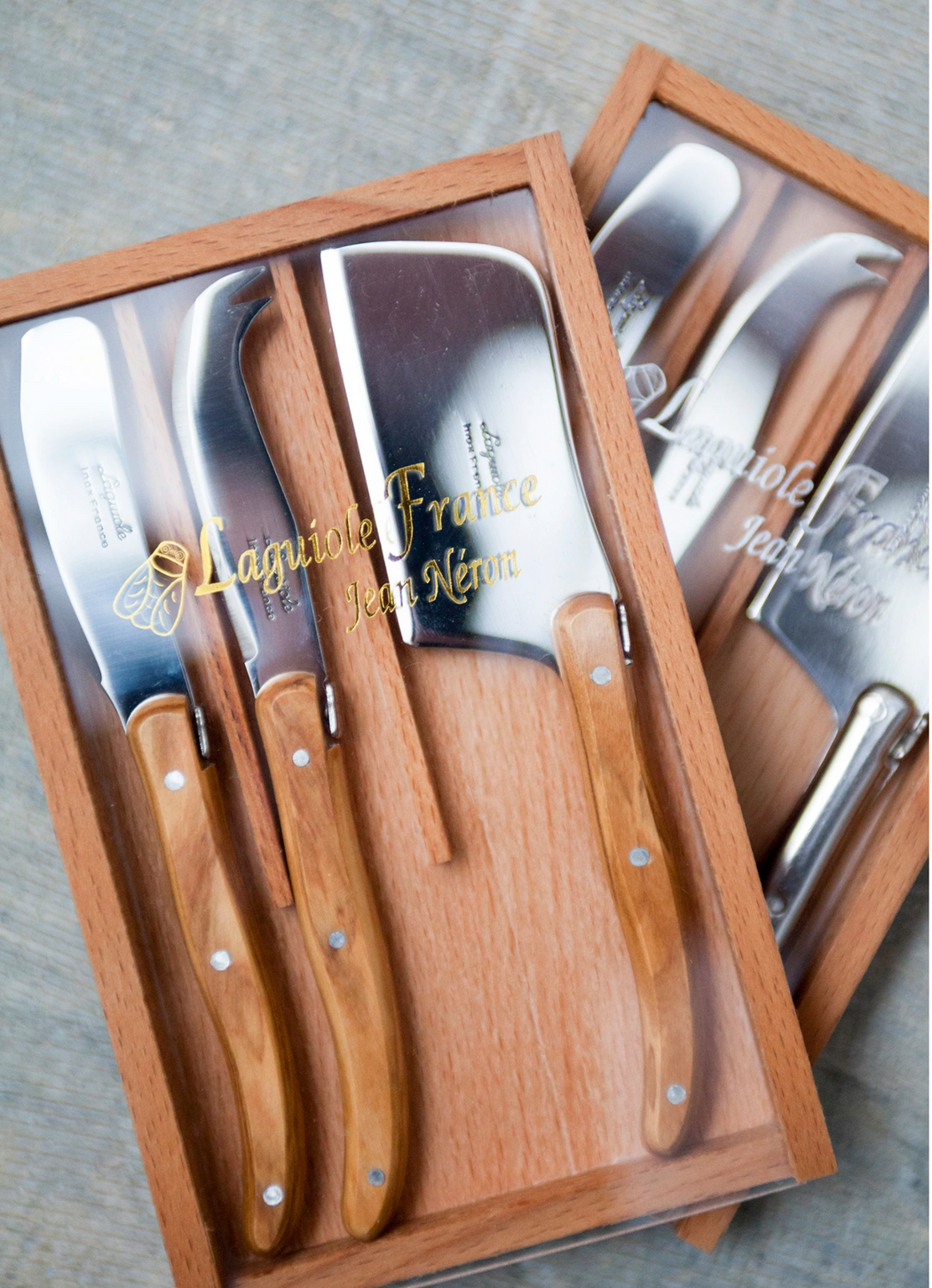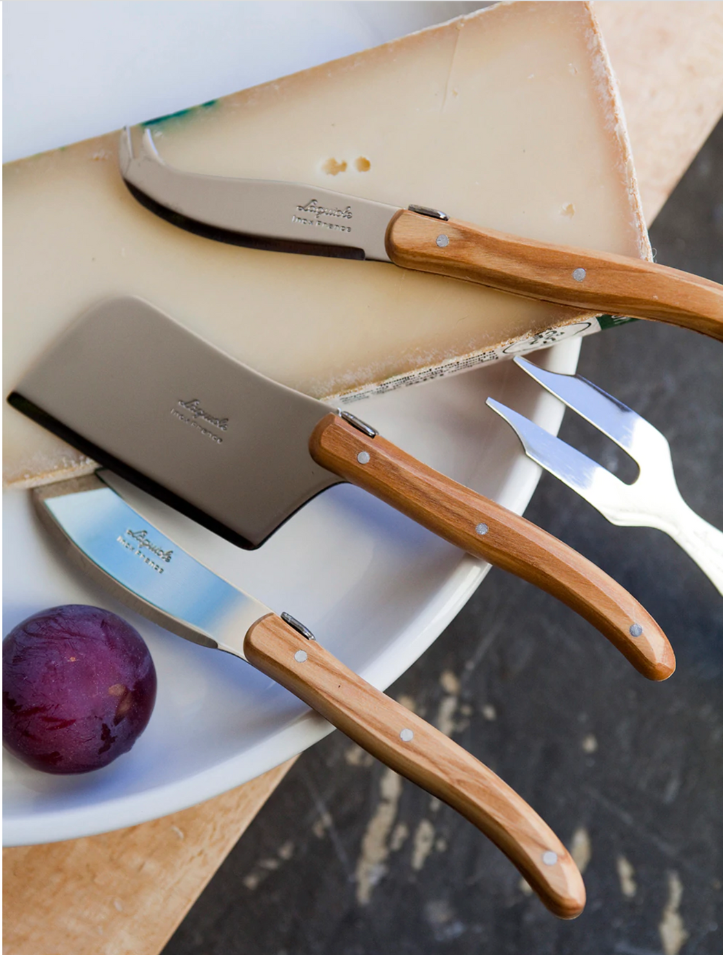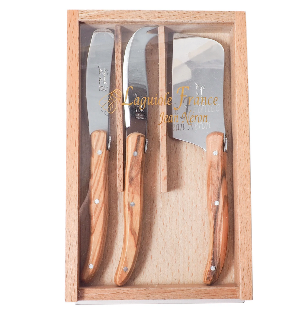 Laguiole Mini Cheese Set. Utensils have olivewood handle and come in wooden box with a sliding acrylic lid. Set of three utensils includes hard cheese cutter, fork-tipped knife and soft cheese spreader.