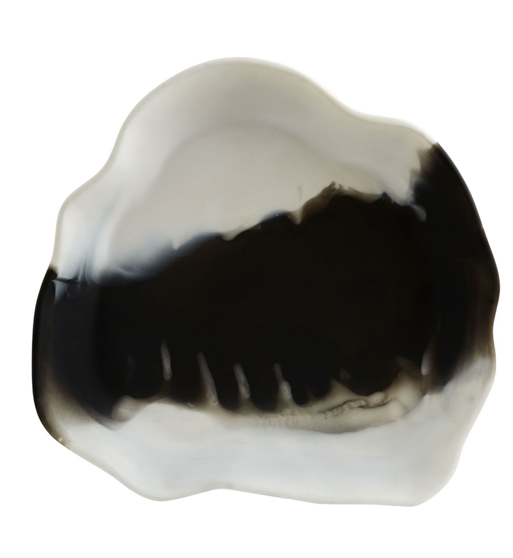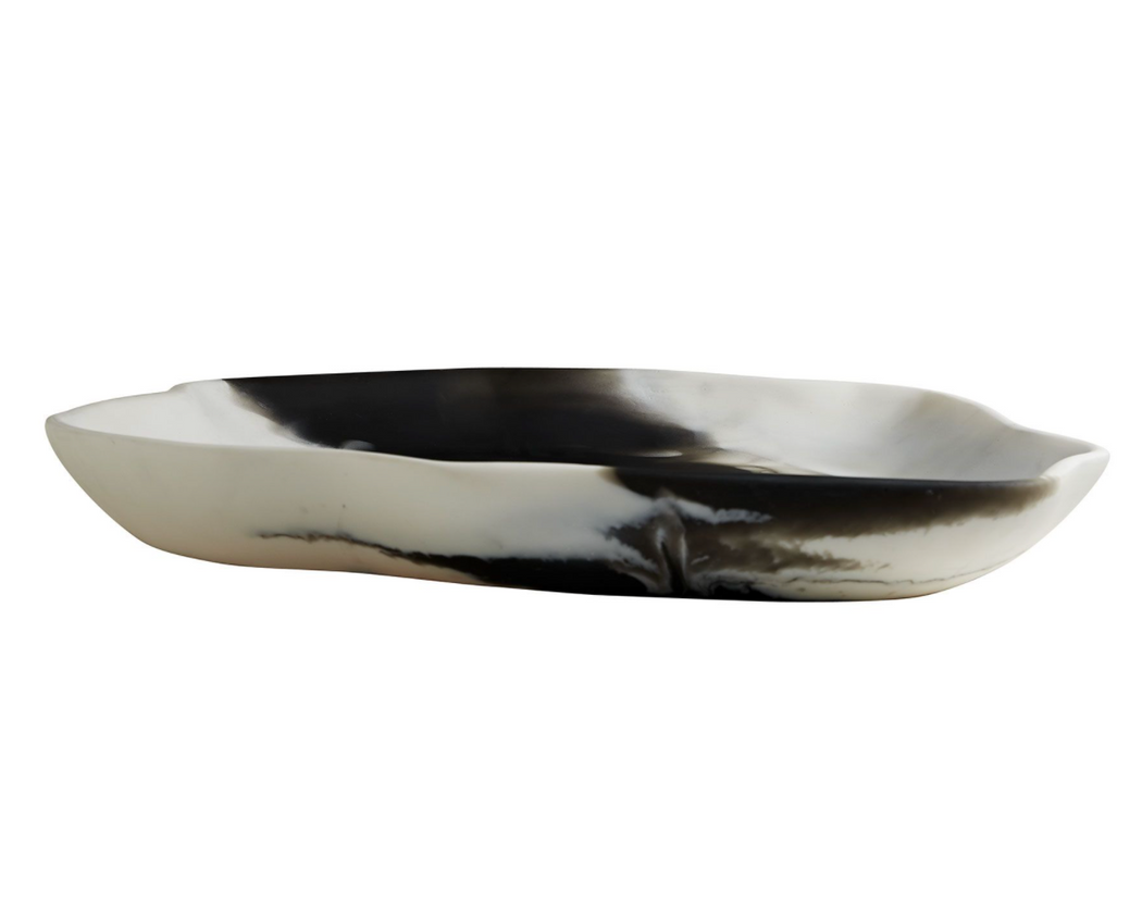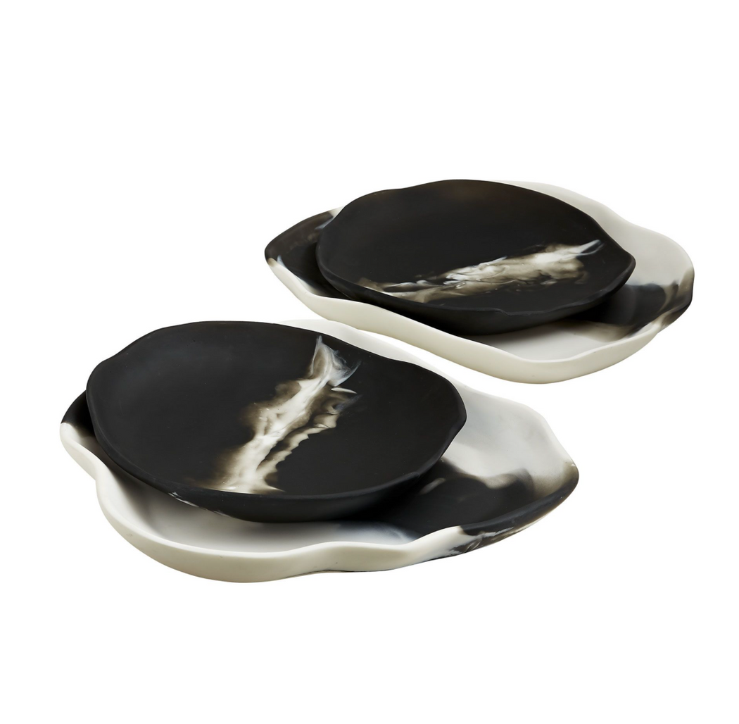 Our Wave Edge Trays explore the concept of yin and yang. Black and white combinations sweep large-scale resin foundations, each with its own distinct swirl patter. Organic edges give the set enhanced natural appeal.