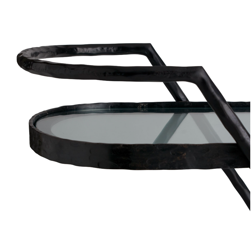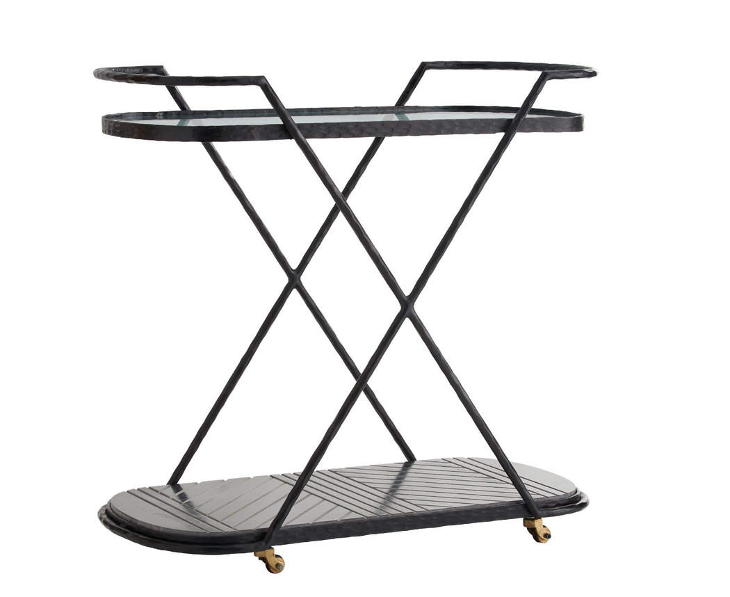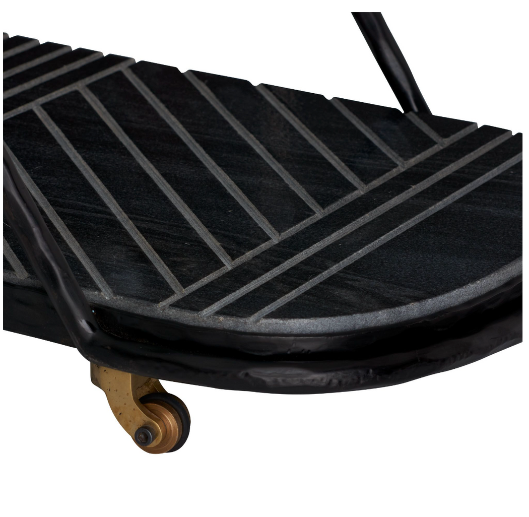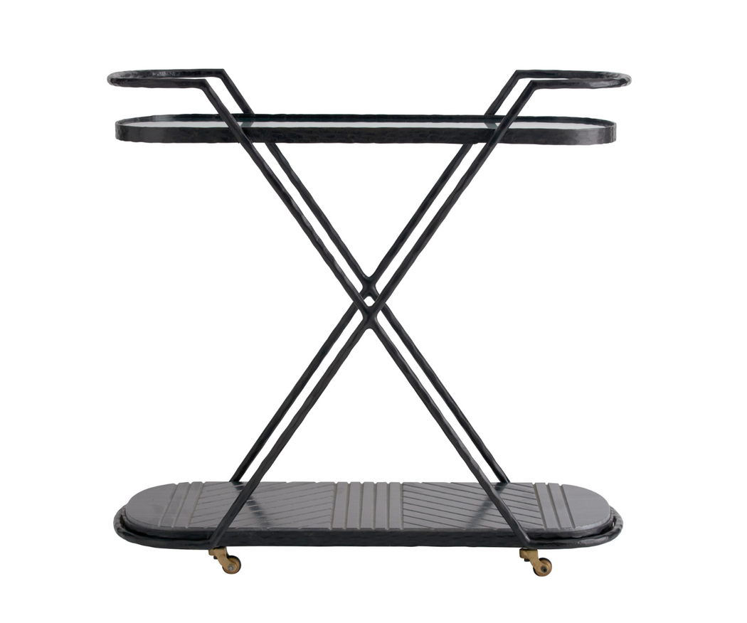 The Nakoa celebrates Art Decor design through rich texture and elegant form. A blackened iron foundation presents a minimalist profile with x-shaped legs that rest on an attached black marble base that doubles as a shelf. The marble features a chiseled decor pattern for a look that emphasized the machine-age and sleek geometric aesthetic.