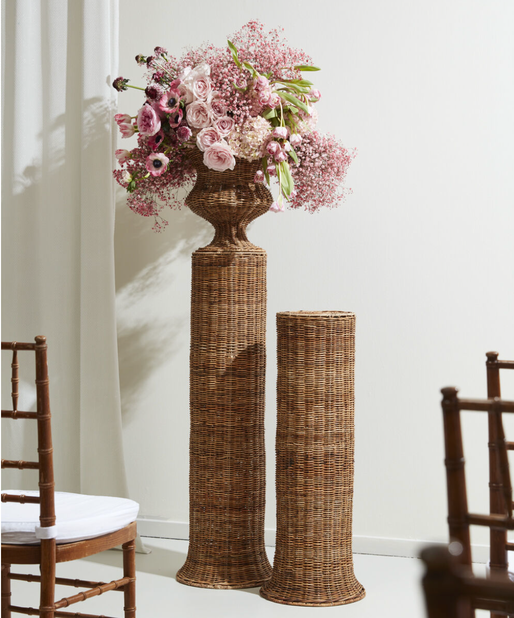 This collection is designed to seamlessly integrate with with The Melita Rattan Column, allowing for a harmonious and stylish look for weddings and events. Its classic shape, combined with curvaceous lines, makes the Melita Collection exceptionally versatile—equally fitting for dressing up a sophisticated event or adding a touch of elegance to your home decor.