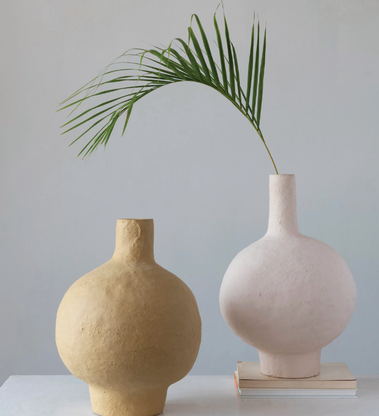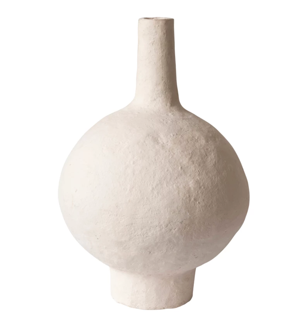 This Mid-Century inspired vase is hand-made in paper mache. Its organic finish plays well in any setting especially minimalistic decor.