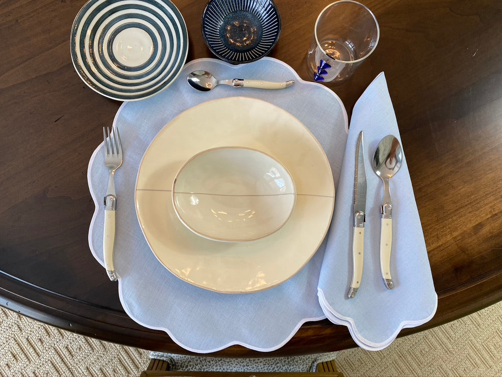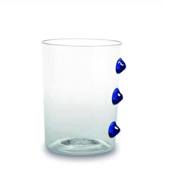 This Italian hand-blown Petoni tumbler will delight your guests at a cocktail party.  Its modern and classic aesthetic allows for daily use or a special event.  It's embellished with glass blue dots around the surface making for a delightful sensorial touch.