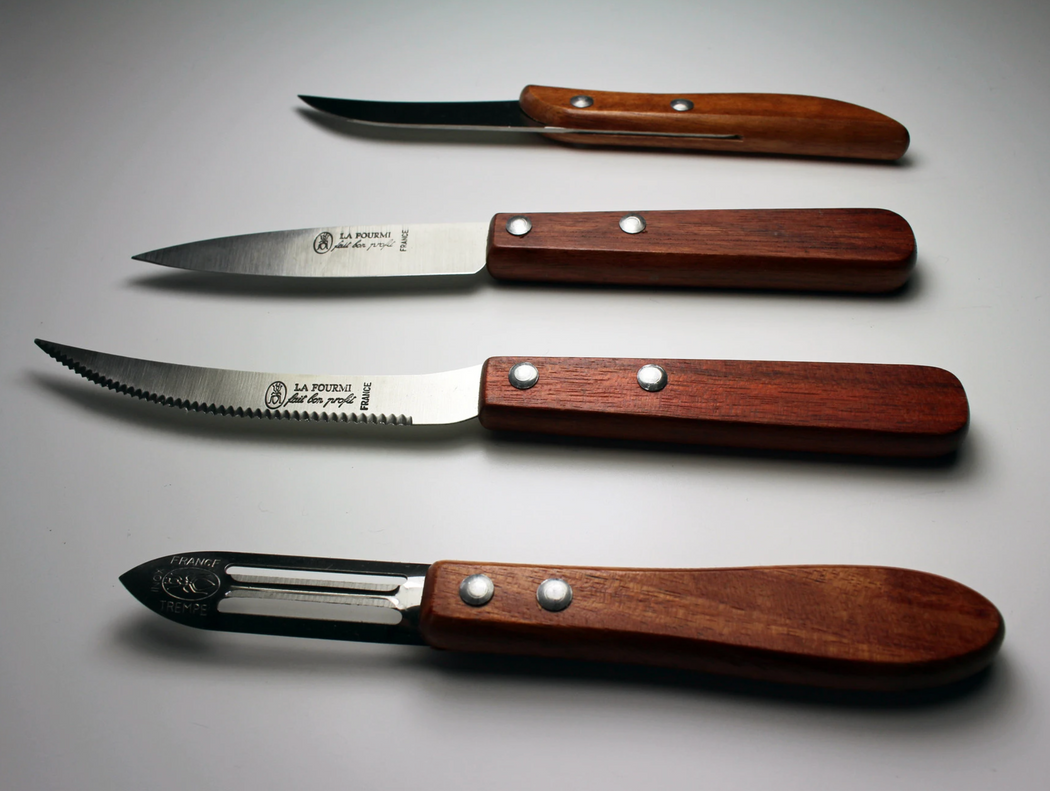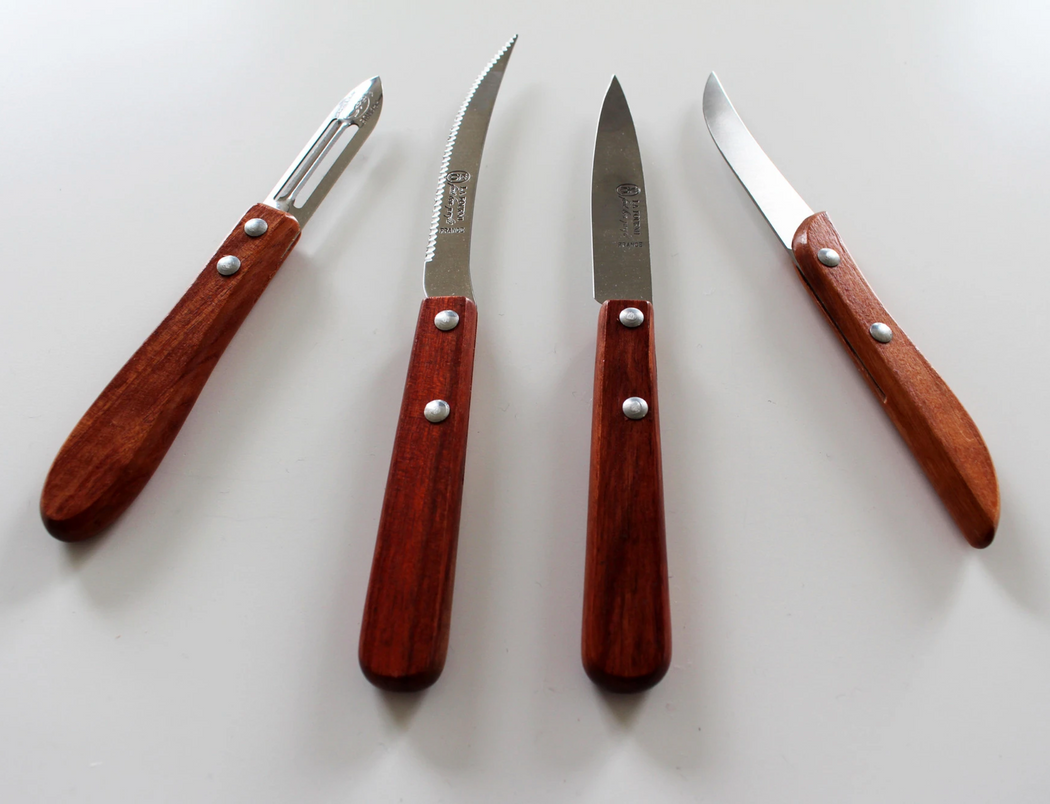 Includes: Serrated Knife, Paring Knife, Vegetable Knife, Peeler Knife.