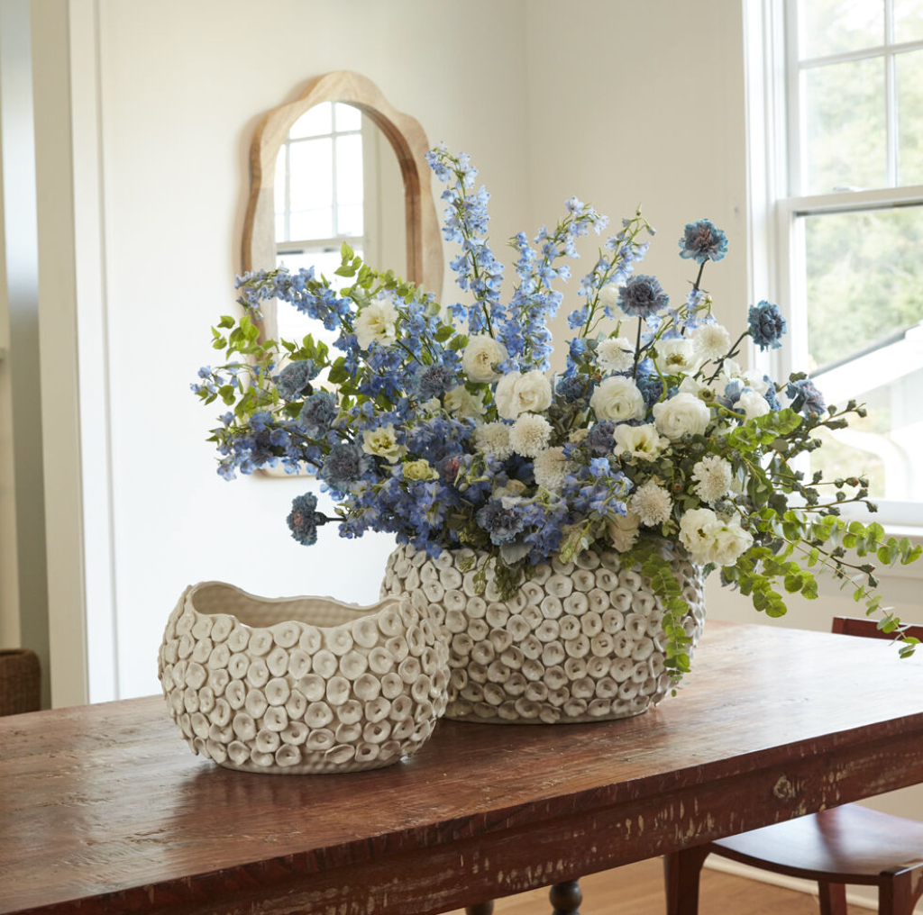 Craft a stunning centerpiece with the Luanda Bowl, where dimensionality, exquisite craftsmanship, and sculptural elegance converge. This expansive, watertight ceramic bowl is adorned with graceful curves and hand-crafted, three-dimensional circular motifs that embellish its exterior. Its off-white, subtly glossy finish and oblong shape with a wavy rim lend a sophisticated touch to any console or dining table. Perfect for showcasing bold floral arrangements or an elegant orchid, the Luanda Bowl elevates any setting.