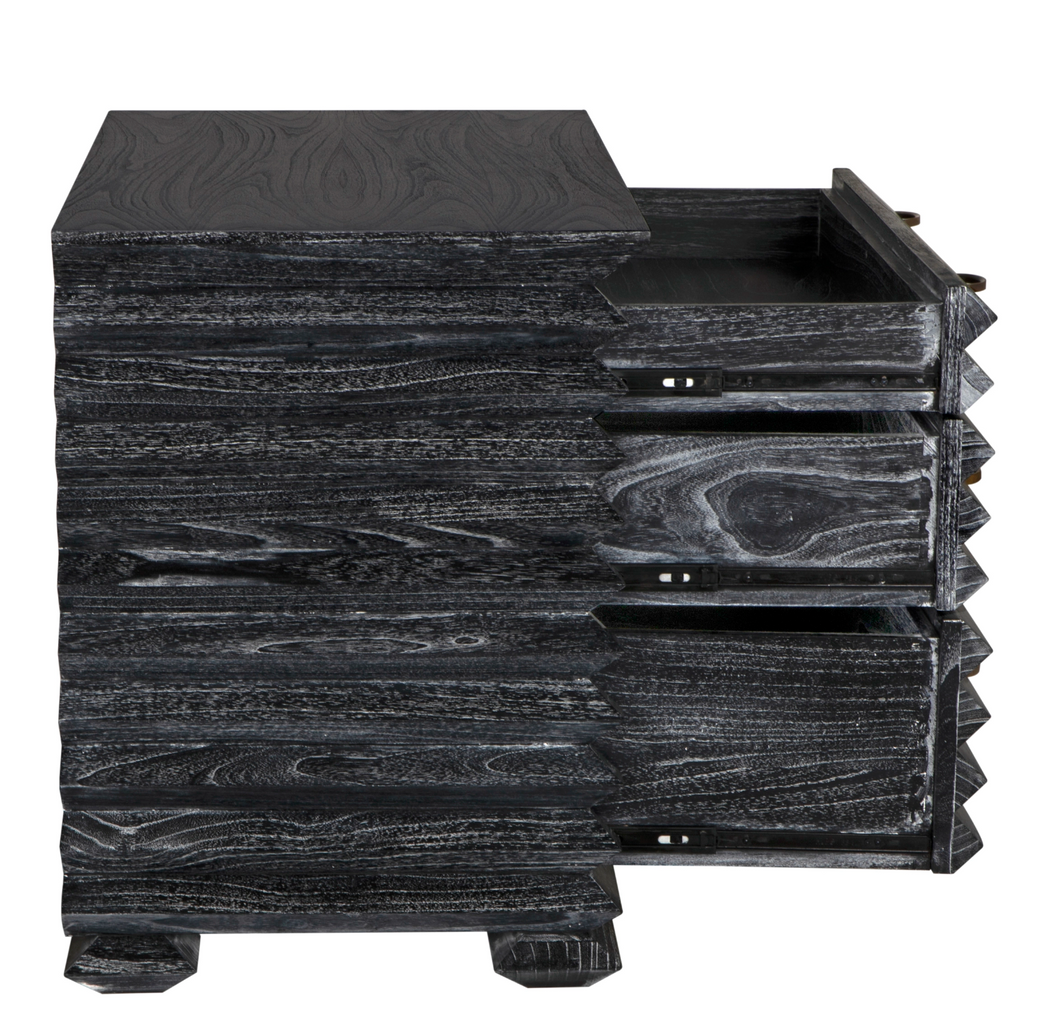 The Tiago Chest is a bold, sculptural statement piece. Its distinctive zig-zag silhouette houses three spacious drawers, each accented with solid brass crescent-shaped pulls. Resting on faceted feet and finished in our rich Cinder Black ceruse, it embodies both strength and refinement. For a touch of luxury, the ceruse finish continues inside every drawer, ensuring beauty in every detail.