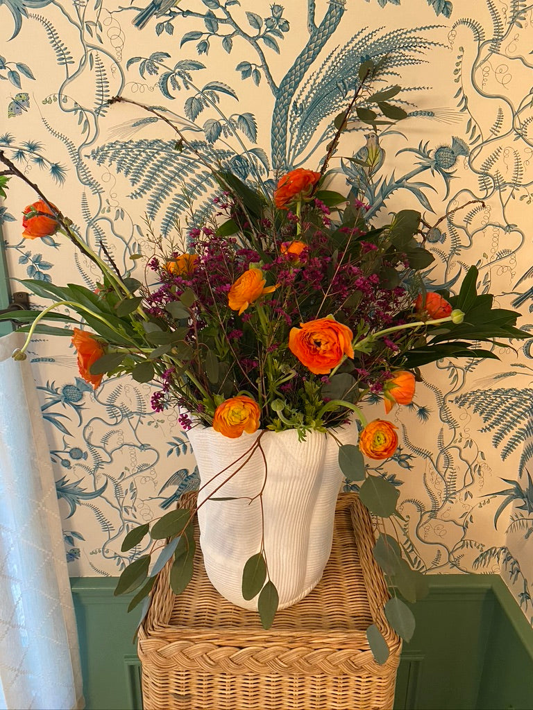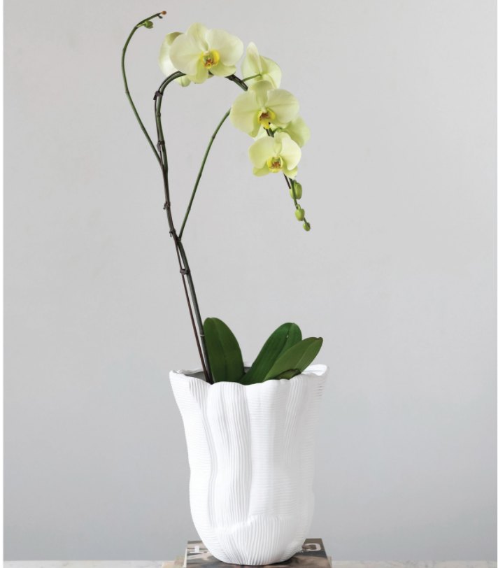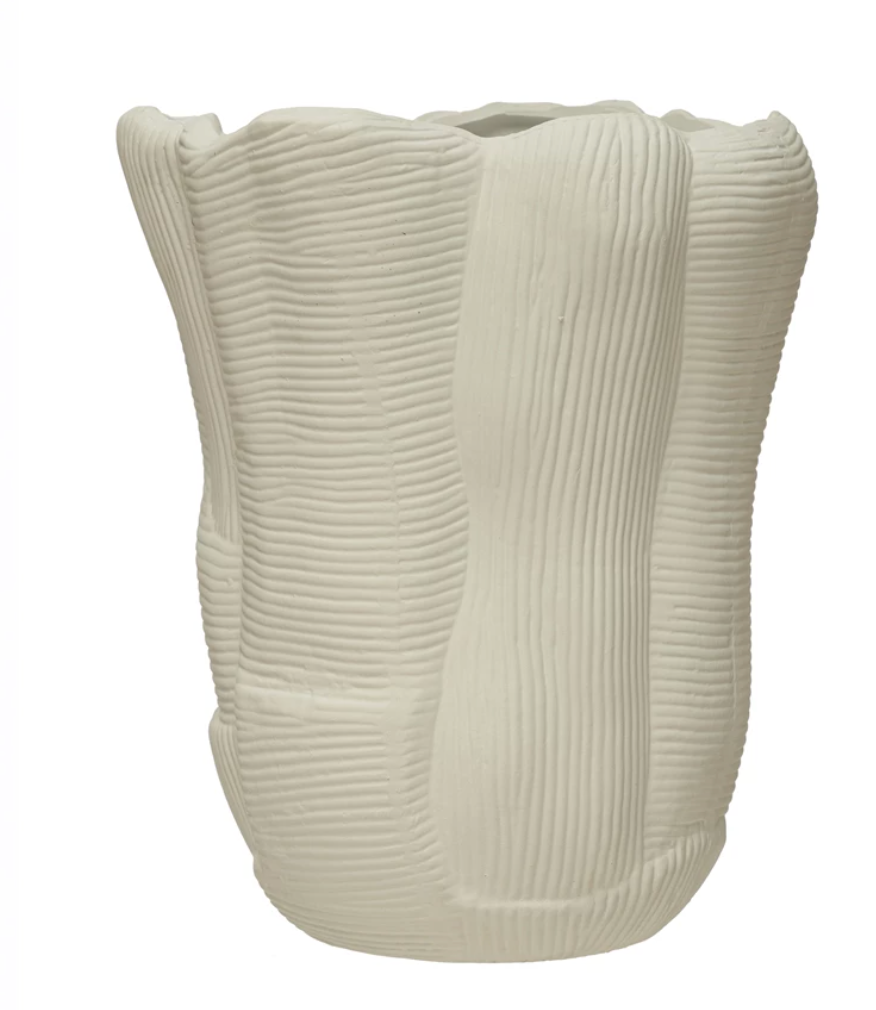 Elegant and unique ruffled stoneware vase with debossed lines and scalloped-edge effect.