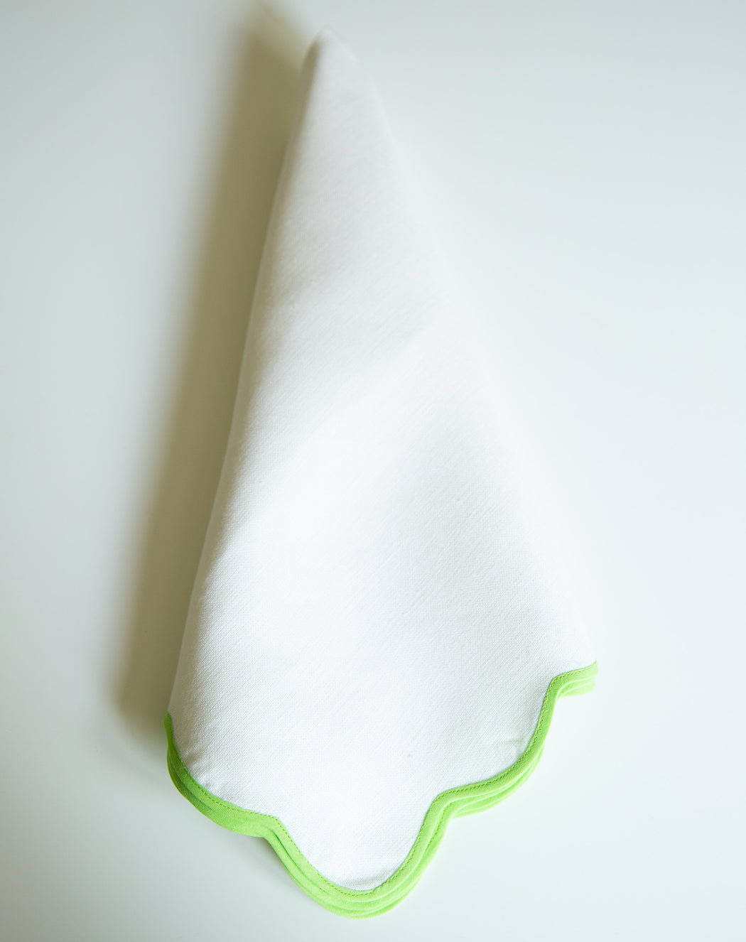 Exclusively designed for Julie and Ev this set of four white and green dinner napkins is constructed in 100% linen and enhanced with a green scalloped border detail that adds an elegant touch to any table setting.