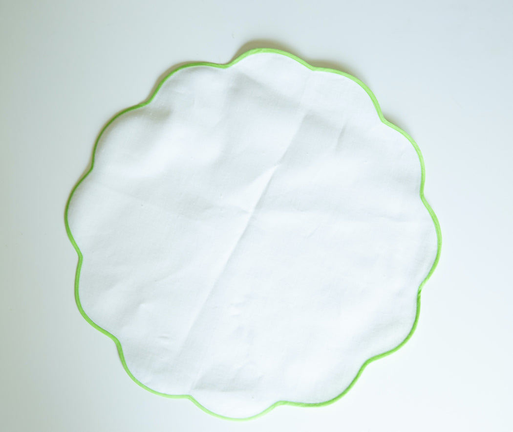 Exclusively designed for Julie and Ev this set of four white and green dinner placemat is constructed in 100% linen and enhanced with a green scalloped border detail that adds an elegant touch to any table setting.