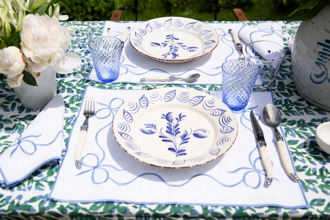 This beautiful and timeless set of embroidered bow cotton placemat and napkin is exclusively handmade for Julie and Ev in the Netherlands. The scalloped edge is hand embroidered in a beautiful classic blue color on 100% organic cotton.