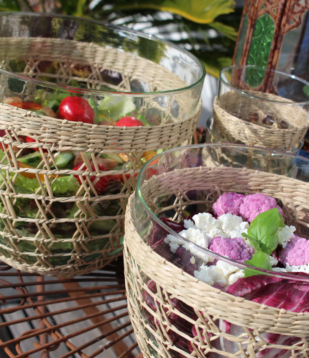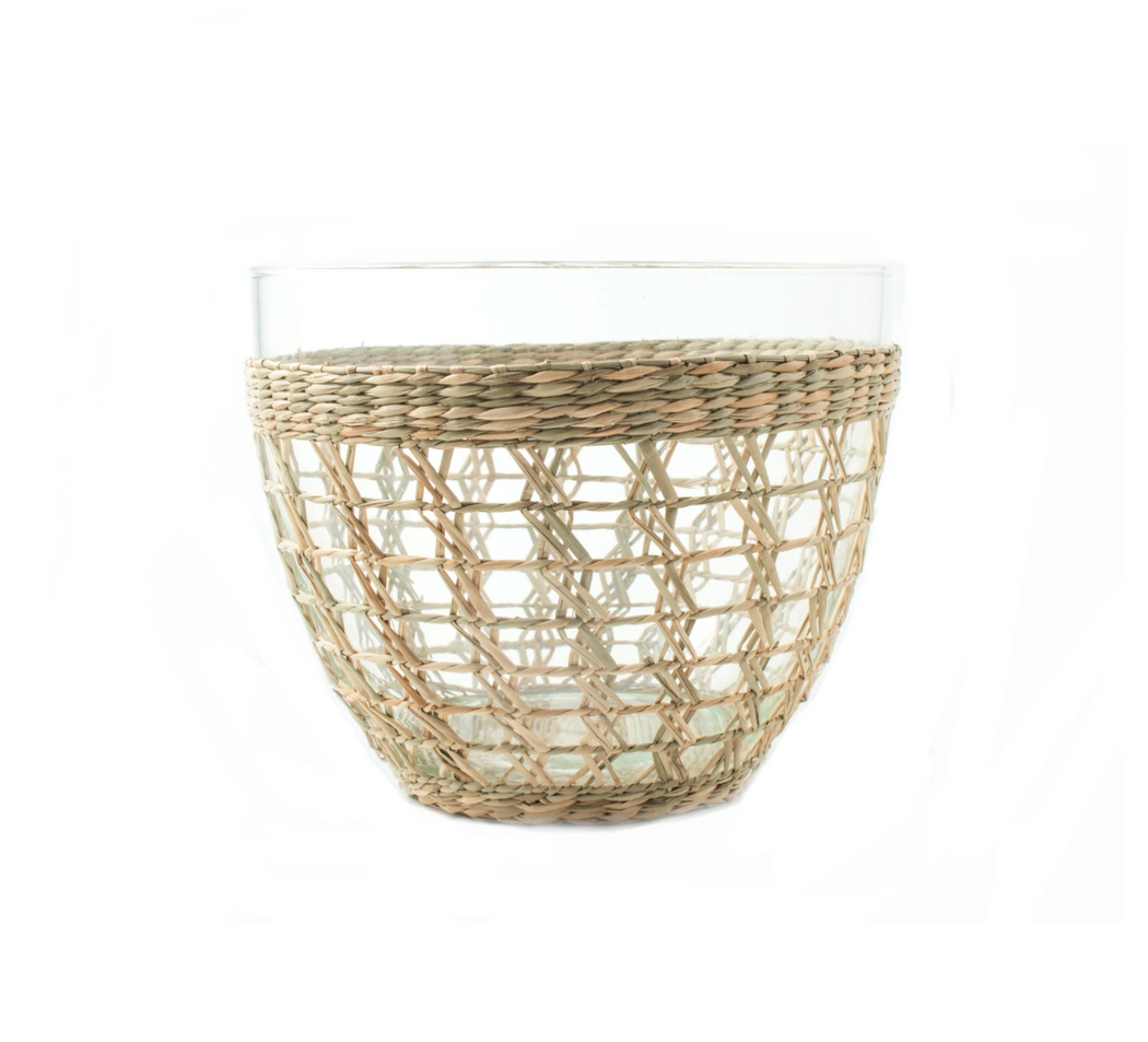 Natural wraps on tumbler and matching glassware make festive pieces for indoor and outdoor entertaining and daily use. Combine this seagrass salad bowl with our large cage carafe for a complete and beautiful set.