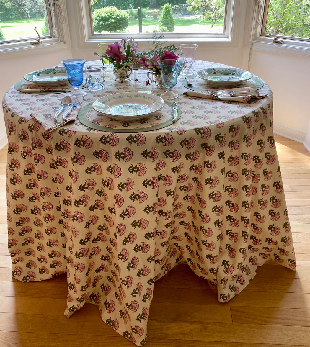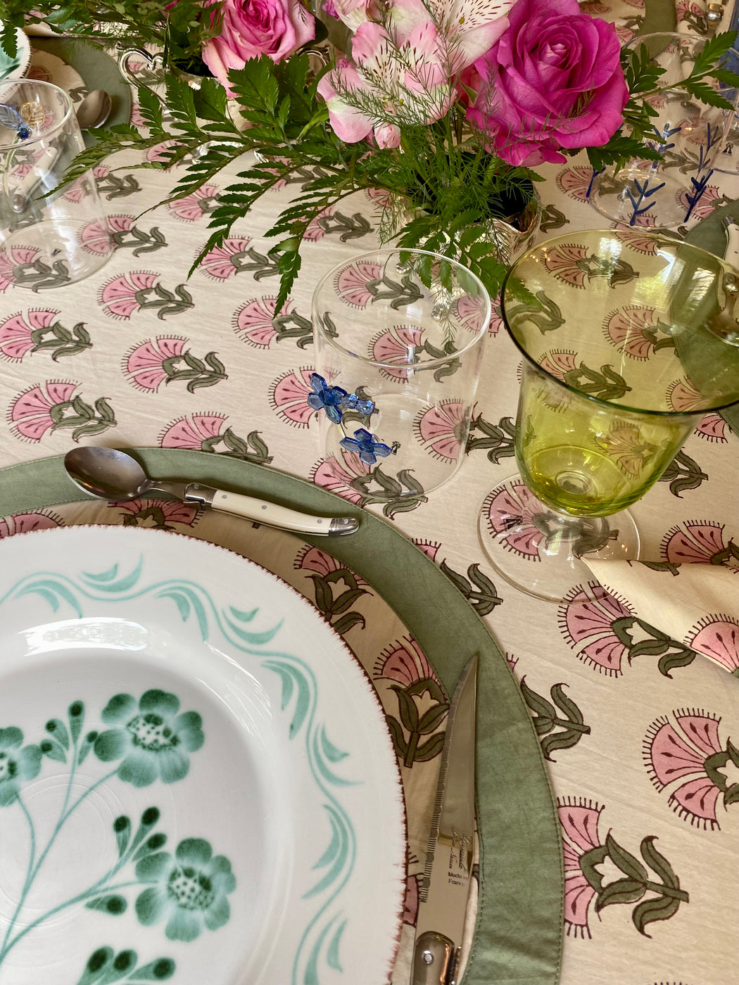 Our Carnation napkins are handmade in India using an ancient technique called hand-block printing.  Pink and green carnation flowers are hand blocked on a neutral background to make them pup and look whimsical.