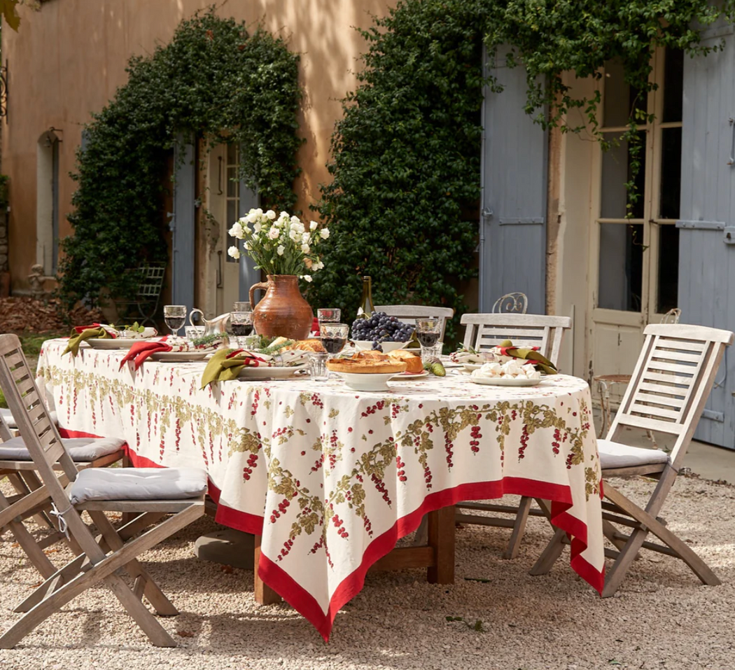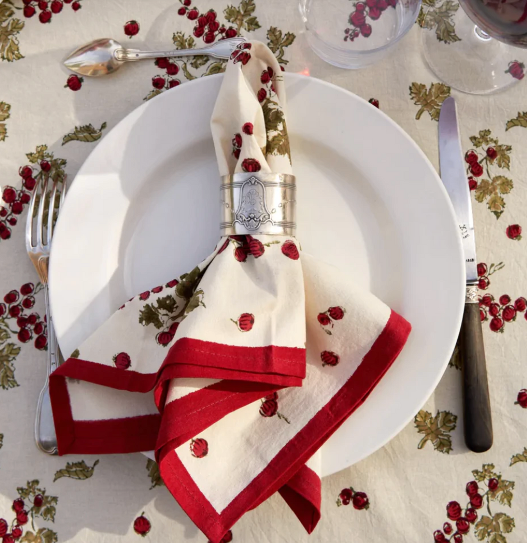 The Gooseberry tablecloth, adorned in vibrant shades of vermilion and lush green, elegantly contrasts against its plain ivory base. Ideal for any occasion, from festive winter celebrations to casual get-togethers throughout the year, it offers a warm and inviting atmosphere for dining. The design's graceful simplicity enhances the beauty of your table arrangement. Each tablecloth is a unique work of art, meticulously handprinted by adept artisans using traditional methods, showcasing their exceptional craftsmanship.