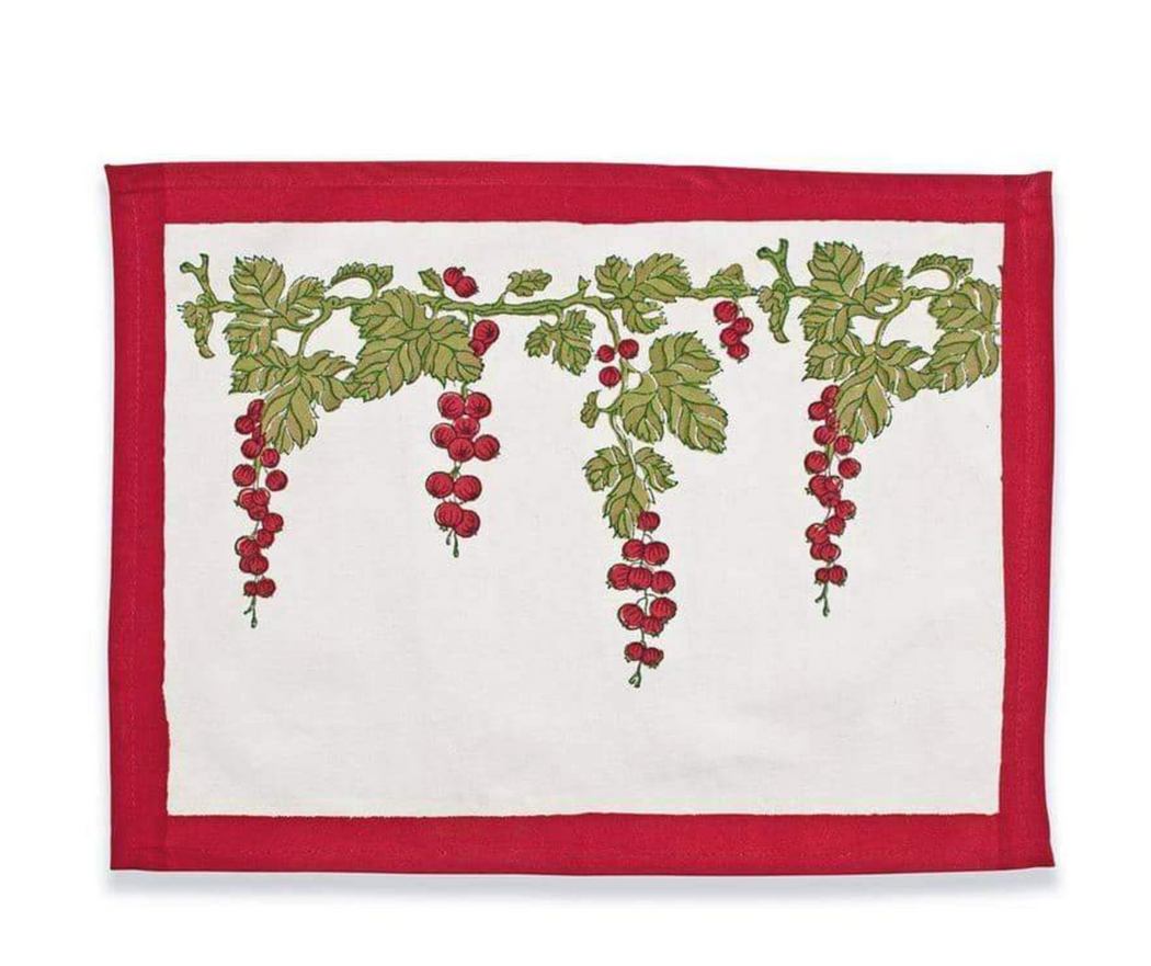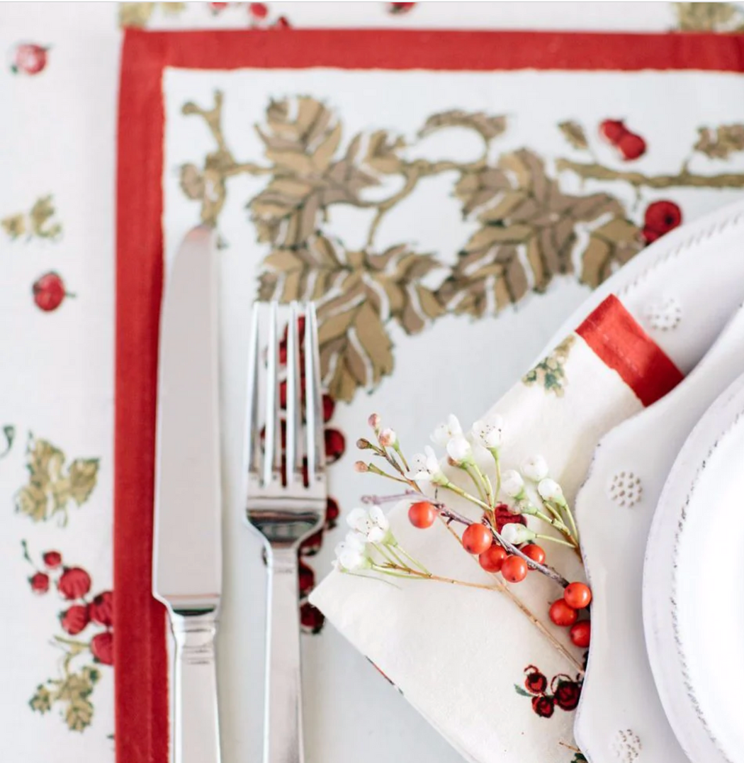 The Gooseberry Collection, with its vibrant vermilion, rich mossy greens, and classic ivory background, is perfectly suited for festive holiday gatherings or any daily meal. The collection, featuring napkins, placemats, and tablecloths, brings a touch of casual sophistication to a plain table, elevating the everyday dining experience. These exquisite French table linens are hand-printed, embodying elegance and quality craftsmanship.