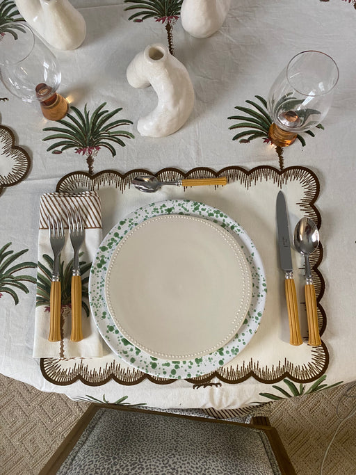 Julie and Ev carries quality dinnerware that allows you to express yourself and style. If you like color, consider set the table with one of our colorful dinner plates or if you prefer to keep things neutral, our white Geranium plates will add texture as well. Contrast the colorful modern plates with a white tablecloth and napkins. To add a touch of casualness to your table setting add one of our rattan wrapped glasses and carafe. Our rattan cage drinking glasses can provide a coastal feel to any table decor.