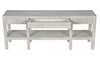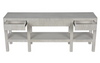 Available in two finishes, this four-drawer console features a modern rectangular silhouette with subtly channeled drawer fronts and a spacious open shelf below for functional display or storage.