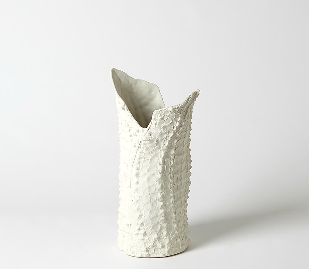 The unglazed white bisque porcelain material pairs perfectly with the crocodile skin texture on these vases.