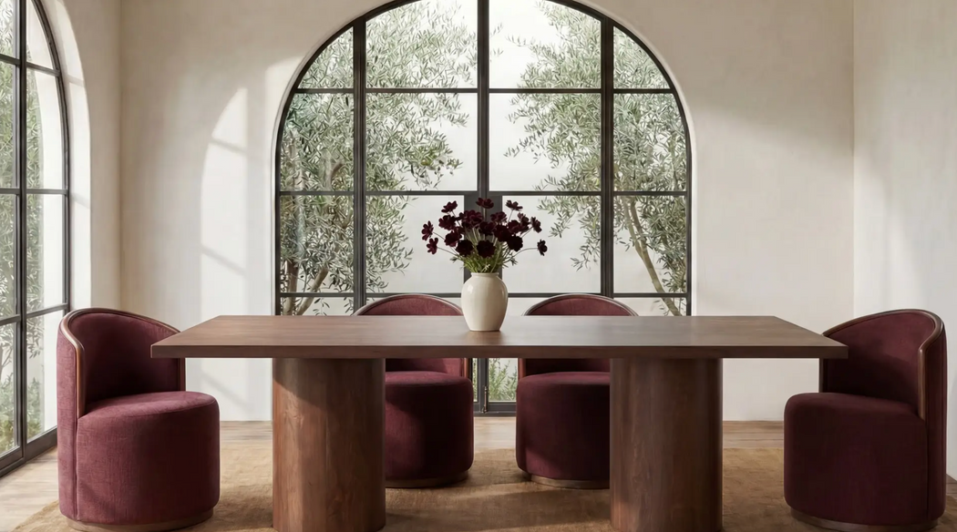Pull up a chair, Hadley sets the tone for gathering. Crafted from reclaimed neem wood, this table lets the grain, knots, and natural history speak with quiet confidence. An extra-thick rectangular top rests on sturdy cylindrical bases, creating a grounded yet graceful silhouette in a warm brown finish. Iron accents add strength where it matters.