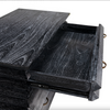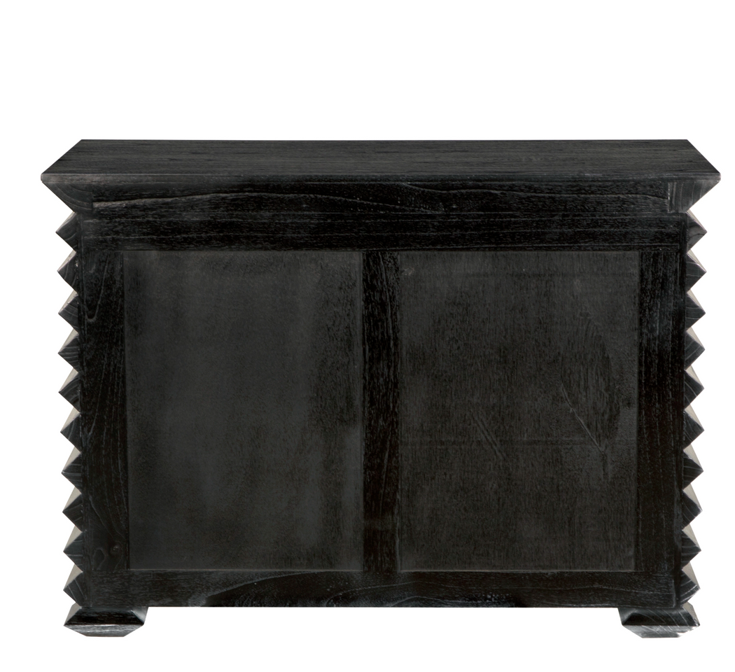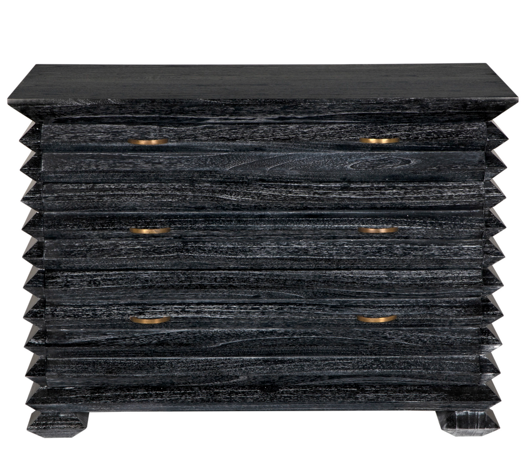 The Tiago Chest is a bold, sculptural statement piece. Its distinctive zig-zag silhouette houses three spacious drawers, each accented with solid brass crescent-shaped pulls. Resting on faceted feet and finished in our rich Cinder Black ceruse, it embodies both strength and refinement. For a touch of luxury, the ceruse finish continues inside every drawer, ensuring beauty in every detail.